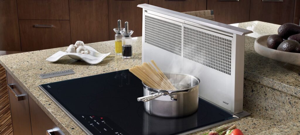 Downdraft ventilation systems are installed directly behind or beside the cooktop and pull air downwards, capturing smoke and odors at the source. They rise from the countertop when needed and retract when not in use, offering a clean and minimalist look. Downdraft systems are particularly well-suited for island cooktops or kitchens where a traditional range hood would obstruct the view.