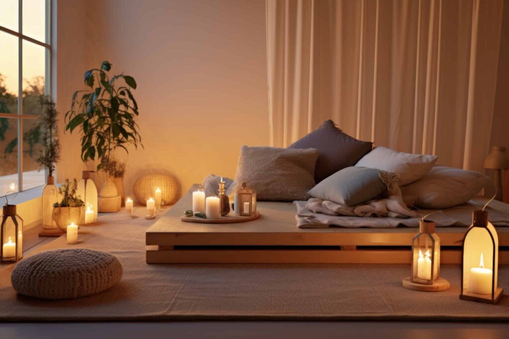 If possible, position your meditation space near a window to take advantage of natural light. Natural light can help to boost your mood and energy levels. However, if you’re sensitive to sunlight, you might prefer to use sheer curtains or blinds to filter the light.