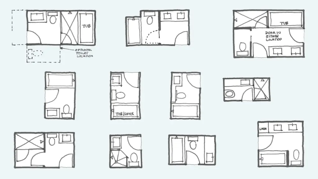 Tips for the Linear Layout: Use a glass shower enclosure to create a sense of openness. Incorporate floating vanities to maximize floor space. Consider a pocket door to save space and improve traffic flow.