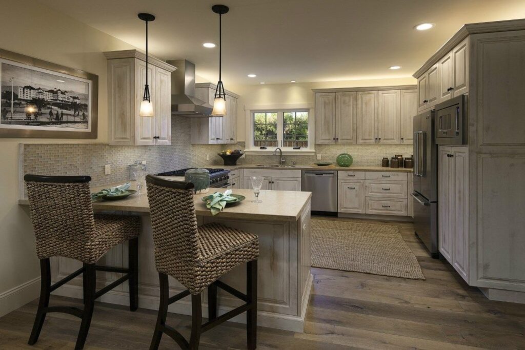 This design evokes the feeling of being by the sea, with light and airy colors, natural textures, and nautical-inspired accents. White or light-blue cabinetry, beadboard paneling, and seagrass rugs are commonly used. The peninsula often features a breakfast bar with comfortable seating and a view of the outdoors. Coastal-themed accessories, such as seashells, starfish, and nautical artwork, add a touch of charm. This style is ideal for those who want to create a relaxing and refreshing kitchen space.