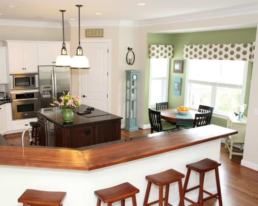 This design features a raised countertop section that creates a separate bar area. This is a great option for those who want to delineate the cooking area from the dining area. The raised bar also provides a convenient spot for casual dining and entertaining. Bar-height stools are typically used with this type of peninsula. The raised bar can be finished with different materials and colors to create a visually interesting contrast.