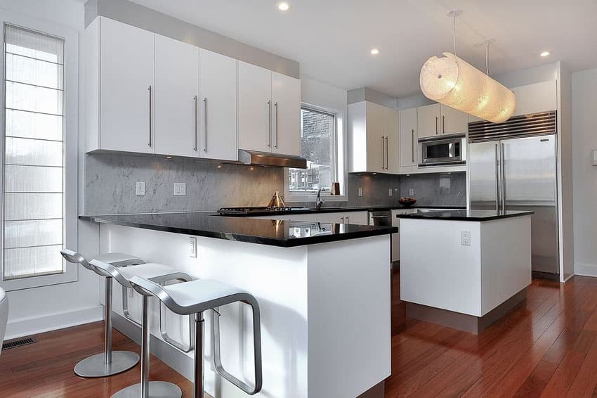 This design embraces clean lines, minimalist aesthetics, and contemporary materials. Quartz countertops, sleek cabinetry, and stainless-steel accents are commonly used. The peninsula often incorporates integrated appliances and hidden storage solutions. Bold colors, such as black, white, and gray, are frequently used to create a striking and modern look. Under-cabinet lighting adds a touch of drama and enhances functionality.