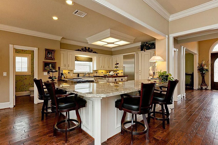 This design features a traditional countertop material, such as granite or marble, paired with classic cabinetry. The peninsula is often used for food preparation and serving, with seating for casual dining. Neutral colors, such as white, beige, and gray, are commonly used to create a timeless and sophisticated look. Consider adding decorative details, such as crown molding and wainscoting, to enhance the classic appeal.