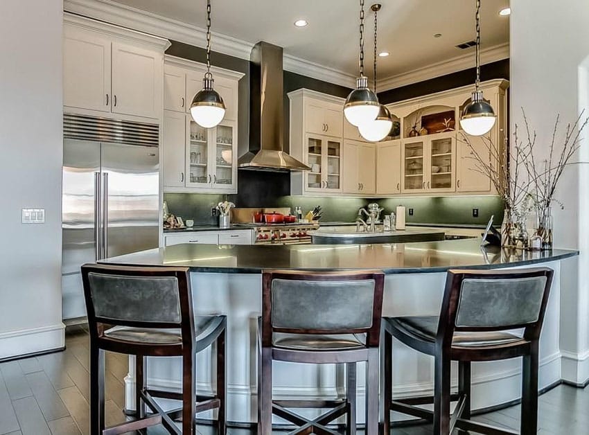 This design features a countertop that extends vertically down to the floor, creating a seamless and dramatic effect. This is a popular choice for modern and contemporary kitchens. The waterfall edge can be made from a variety of materials, such as granite, quartz, or concrete. This design adds a touch of luxury and sophistication to any kitchen.