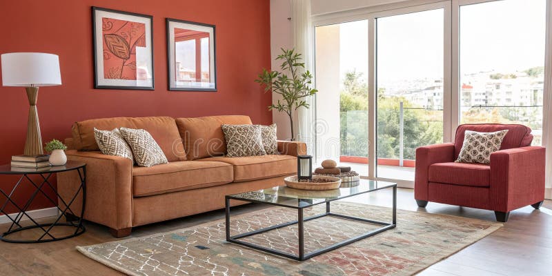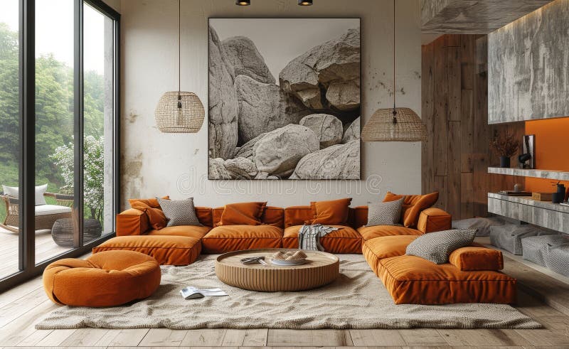 Stylish Modern Living Room with Terracotta Sofa and Natural Views Stock