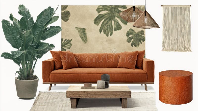 Mood Board Showcasing a Warm Living Room Design with Terracotta Sofa