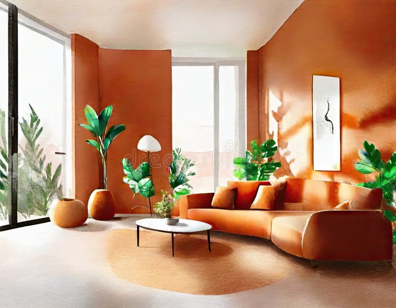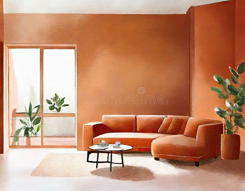 Watercolor of Warm Modern Living Room with Terracotta Wall and Comfy