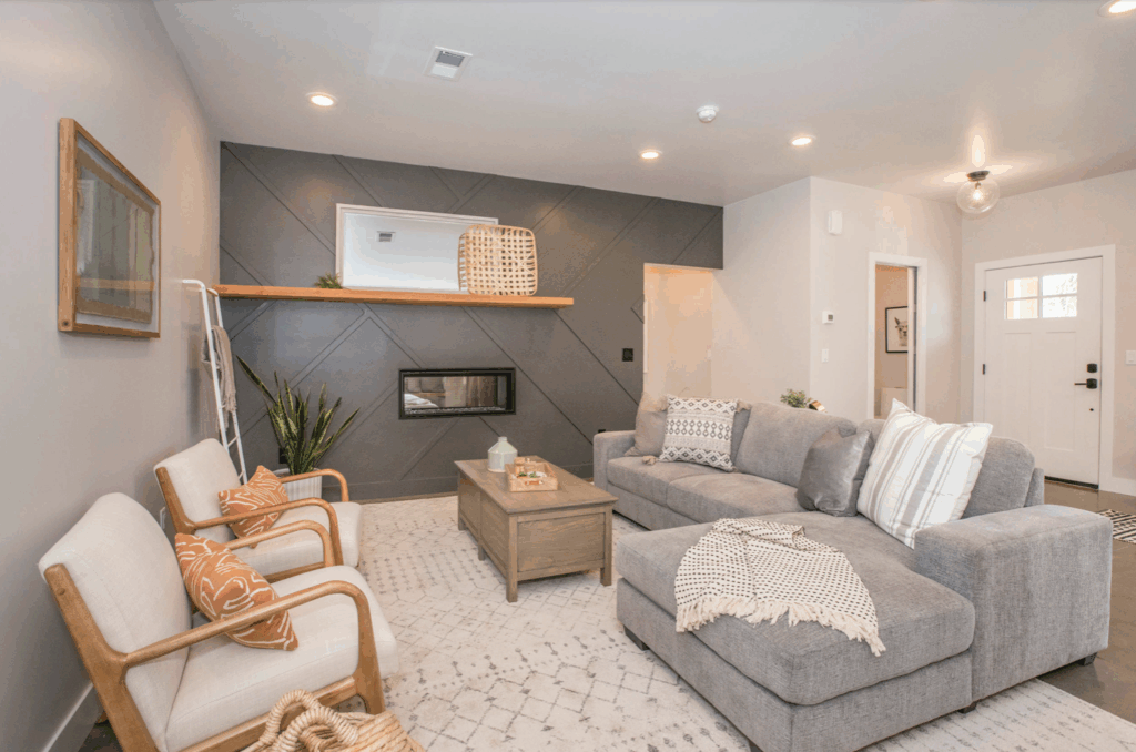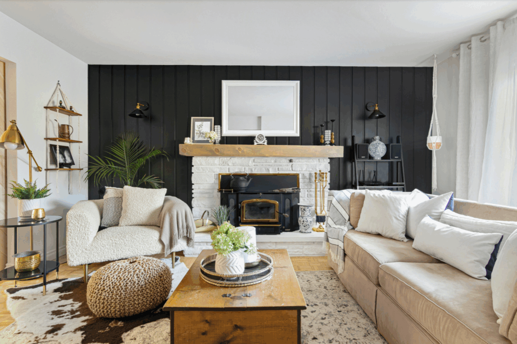 • Easy to Update: If you get tired of your accent wall, it’s easy to change! Repainting or swapping out wallpaper is a relatively quick and inexpensive way to refresh your living room’s look and feel.