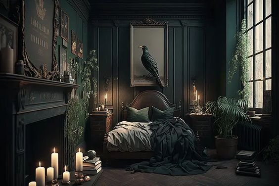 - Bedroom: Incorporate dark colors, velvet fabrics, and antique furniture to create a cozy and romantic bedroom.